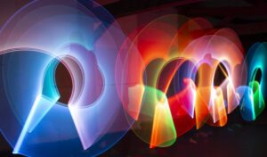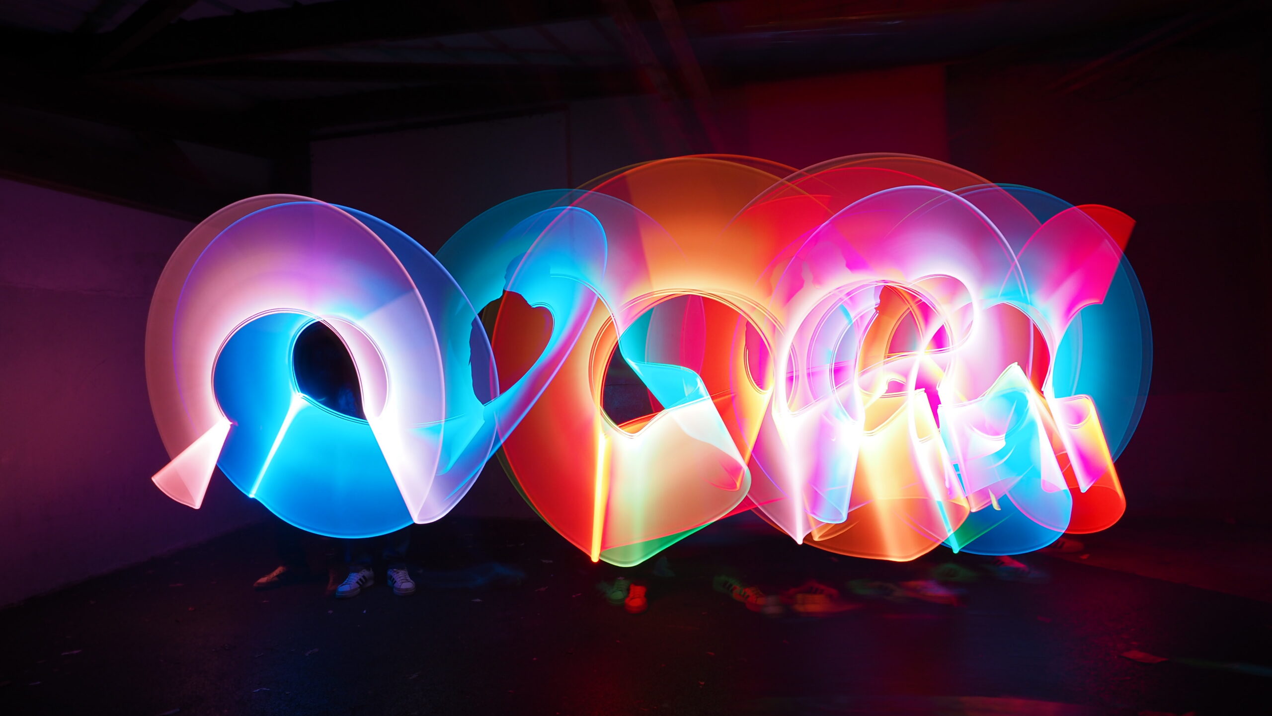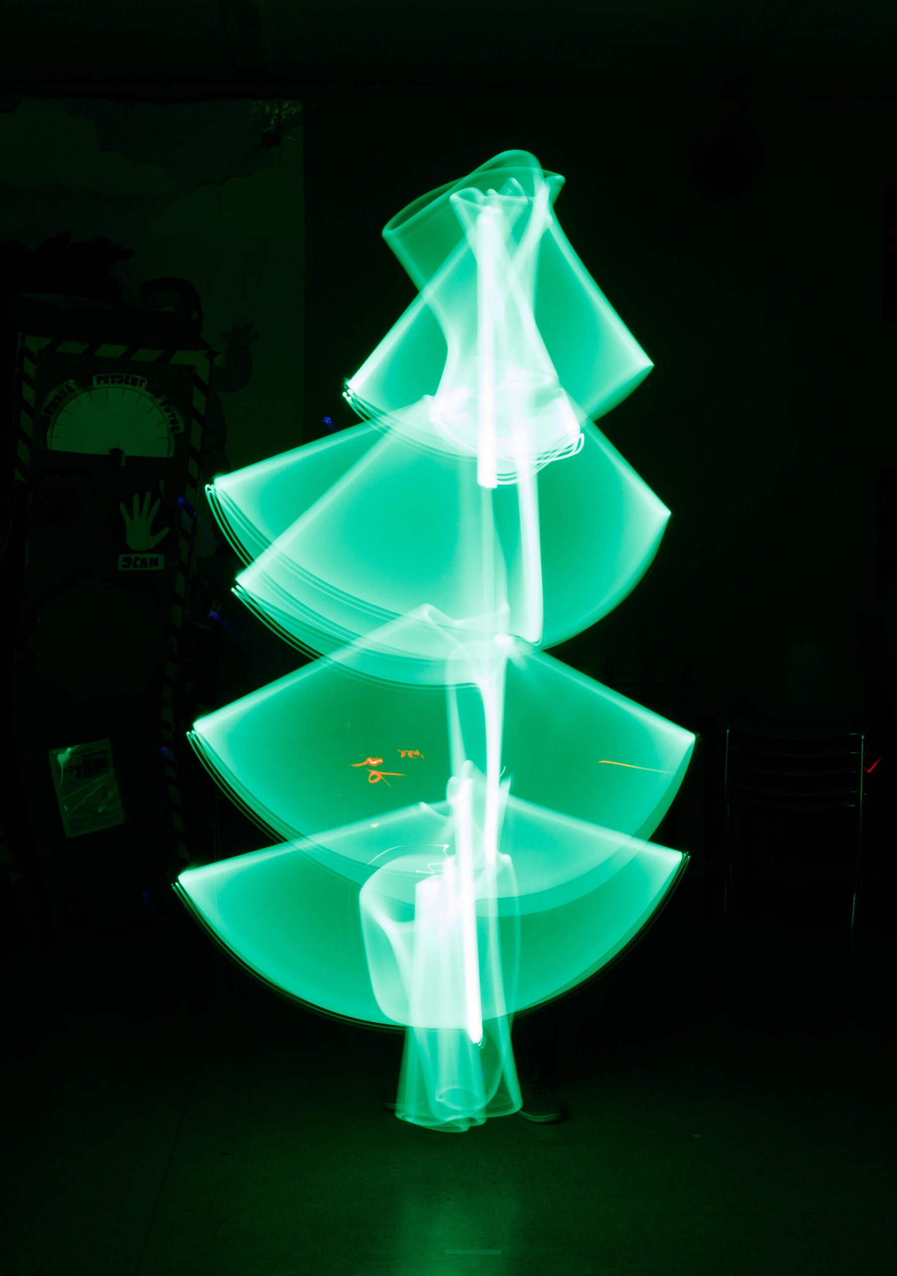 Lors de la séance suivante, l’ambiance était tout autre. Nous avons recherché le noir absolu afin de mettre en pratique le lightpainting, qui consiste à éclairer des objets ou des personnes, ou encore à dessiner à l’aide de lumières de différentes couleurs pour obtenir de belles créations. Chacun s’est équipé de son appareil photo et de son trépied afin de réaliser, comme on dit, des poses longues (entre 20 et 30 secondes) permettant de capturer ces jolies formes. Je vous laisse découvrir…